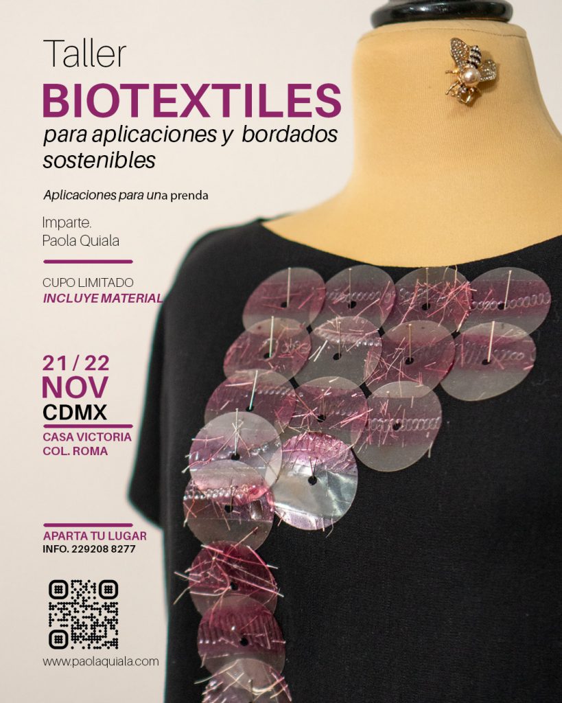 Aquí encontrarás una presentación de los talleres que imparto, donde mi experiencia en diseño textil se combina con mi forma de percibir el diseño a lo largo de mi experiencia y que junto con los métodos aplicados al biotextil en combinación con diferentes técnicas como bordado tradicional y otras de fibras, van forman historias y creando experiencias creativas dentro del área donde te desarrolles.
